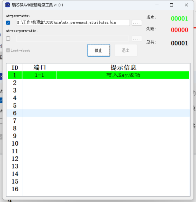 当出现写入key成功,则表示刷bin文件成功,如图17所示: